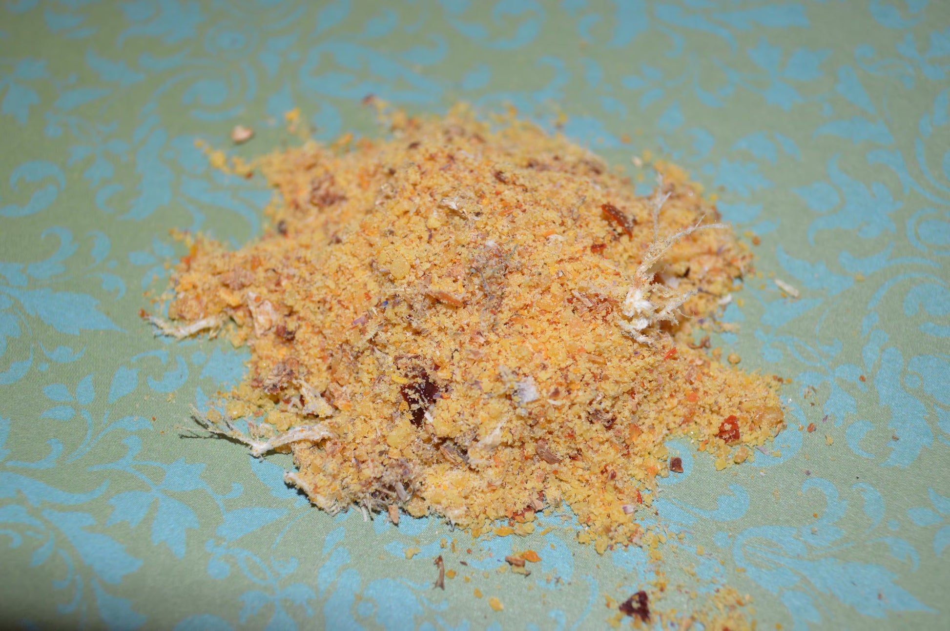 This is a blend of egg, dehydrated frog legs, pumpkin, cauliflower, red pepper flakes, and red clover blossoms. Note: frog legs make up a small portion of this mix. The mix is ground up to evenly distribute the frog legs. About half of the mix is egg.