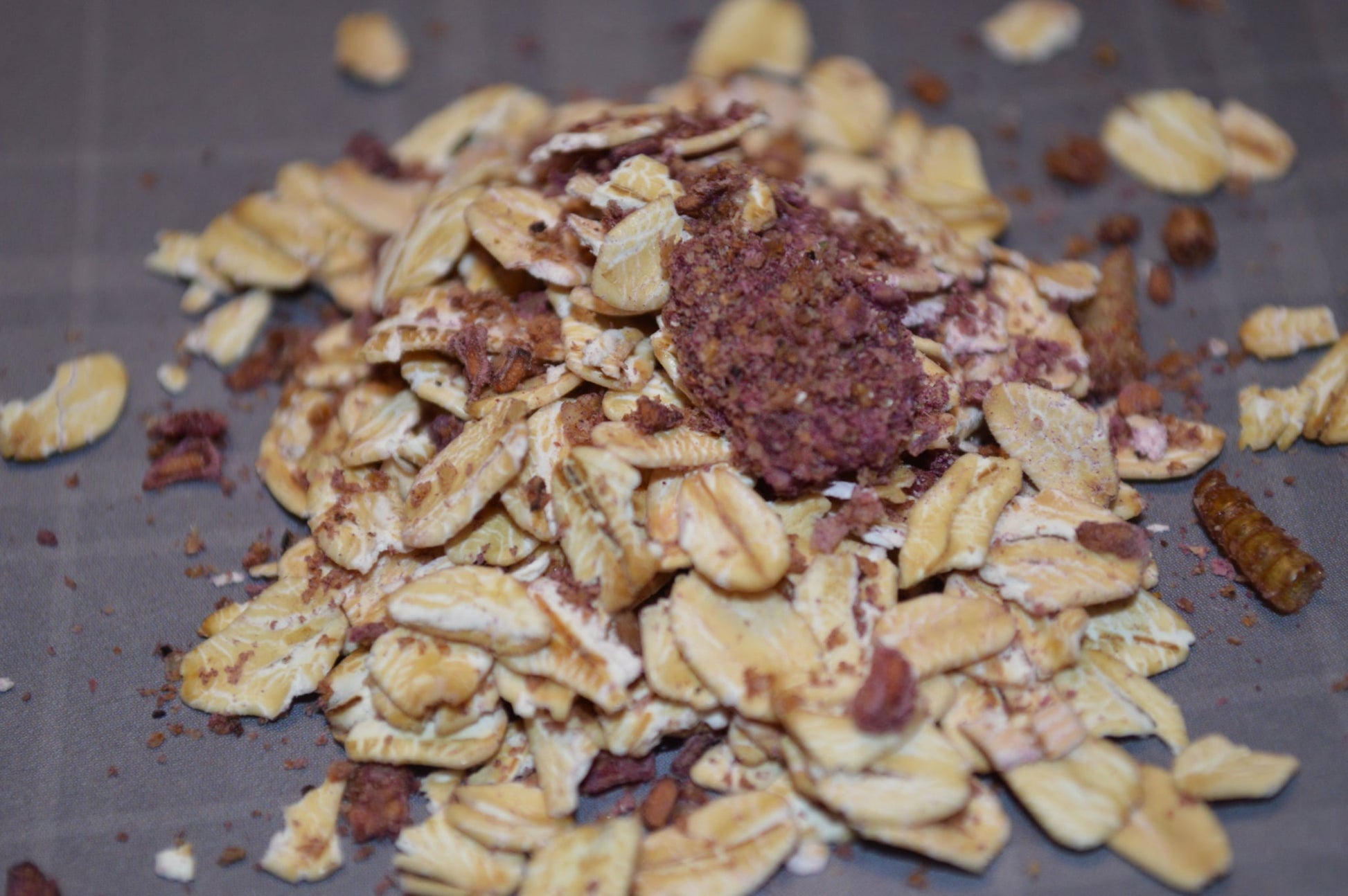 This is a blend of oats, mealworms, raspberries, and purple sweet potato powder.