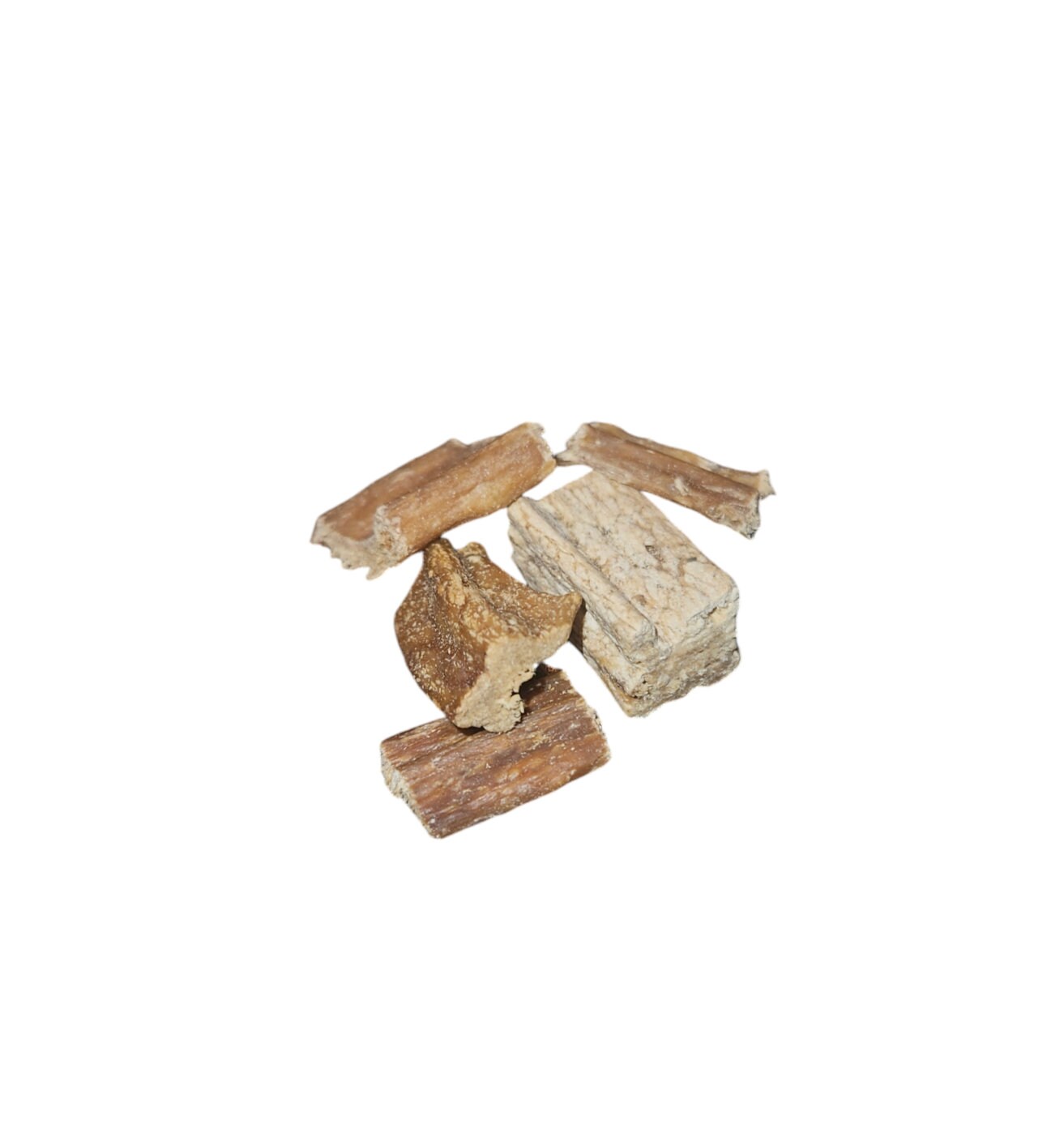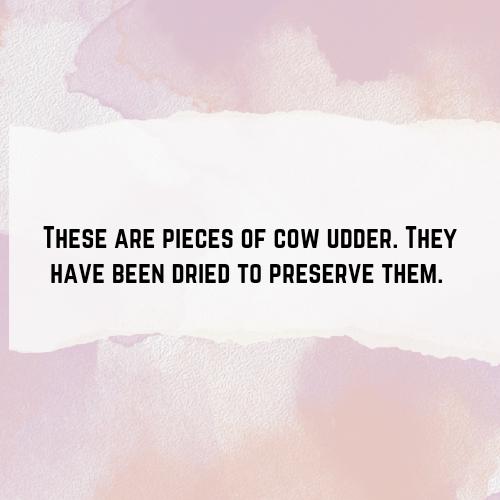 Udder Bites are dehydrated cow udder. There are multiple pieces stuffed in each bag. These are solid little pieces. The amount of pieces will vary, but the bags are filled all the way full.